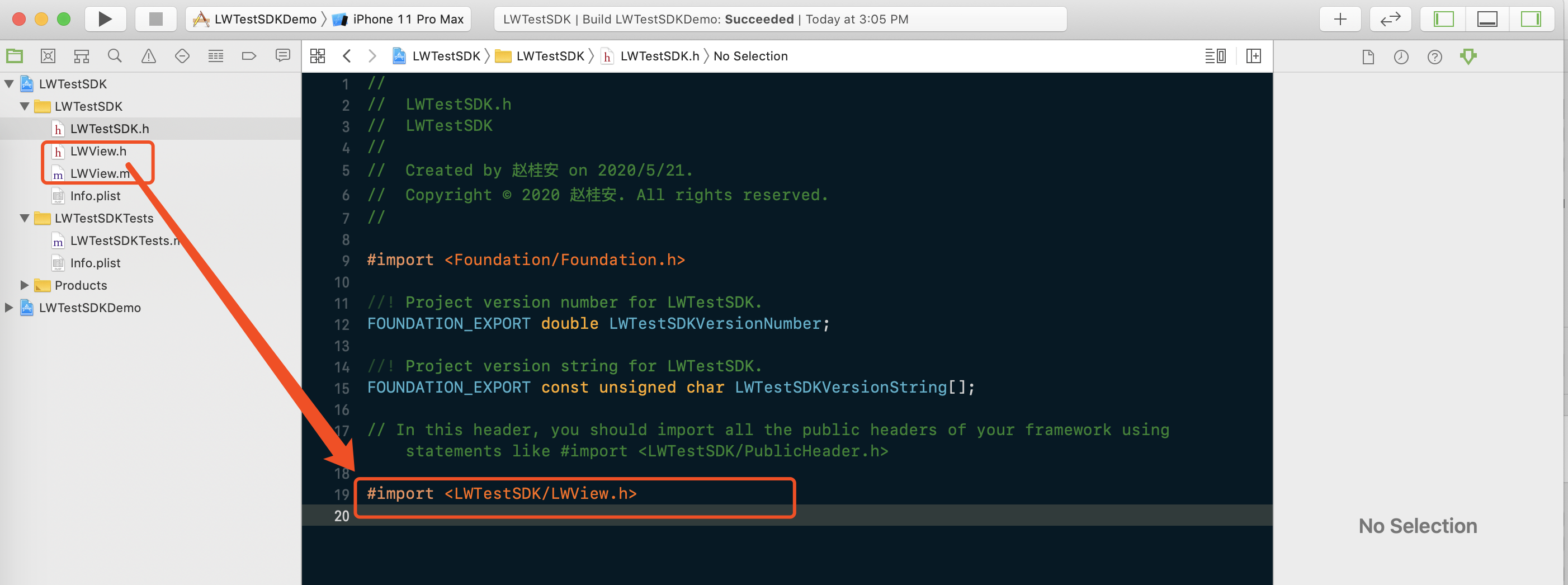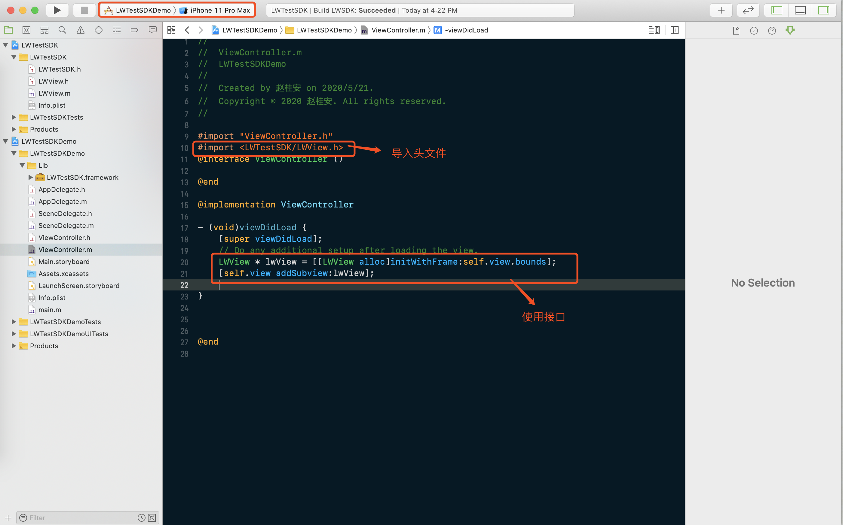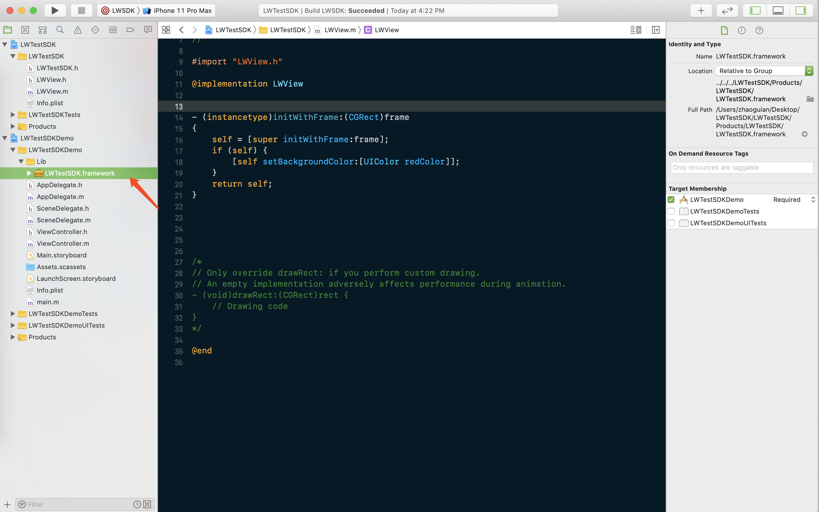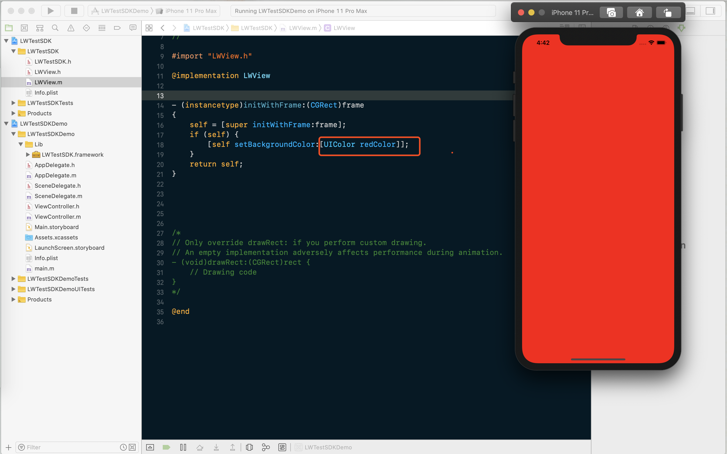 这时候SDK跟Demo就关联起来了,此时修改下面SDK中的代码,运行demo就是修改后的效果,然后就可以愉快的在这个工程里面开发调试SDK了,如果我把LWView的颜色设置为orange,再去运行demo,看一下效果