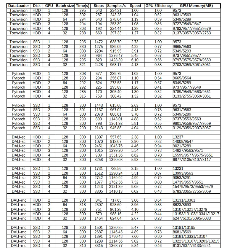 其中 DALI-mc 由于没有单卡训练模式,GPU Efficiency 以 sc 模式的单卡训练结果作为基准。