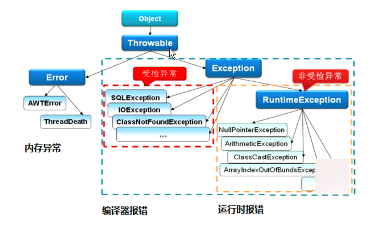 这种异常都发生在编译阶段,需要进行捕获异常,Java编译器会强制程序去捕获异常。try-catch