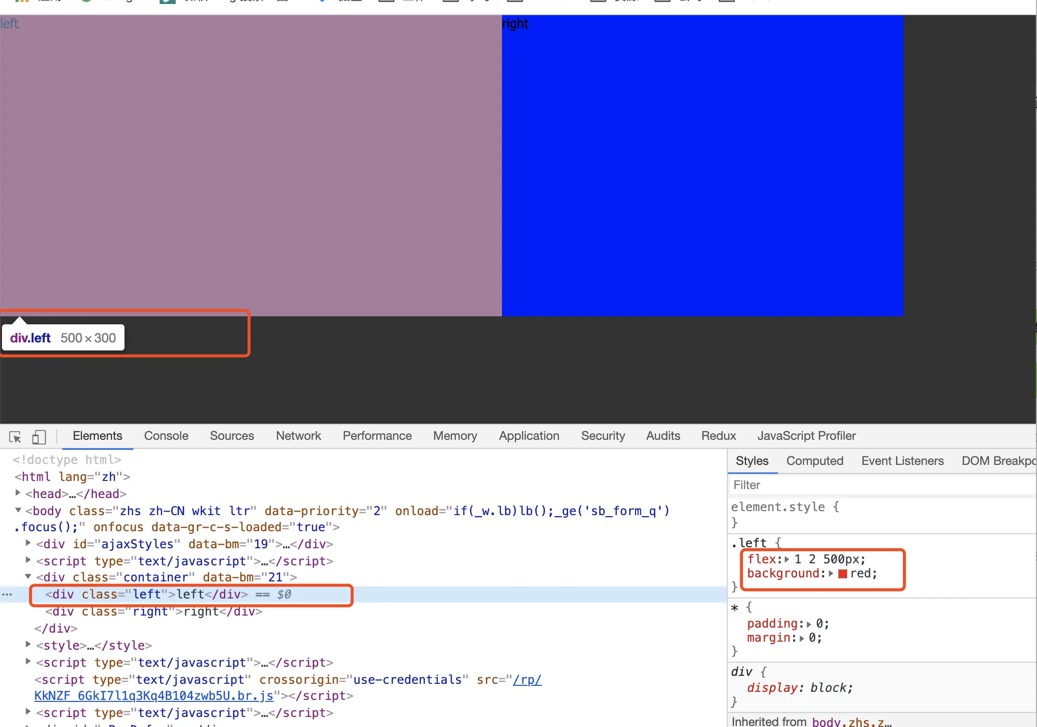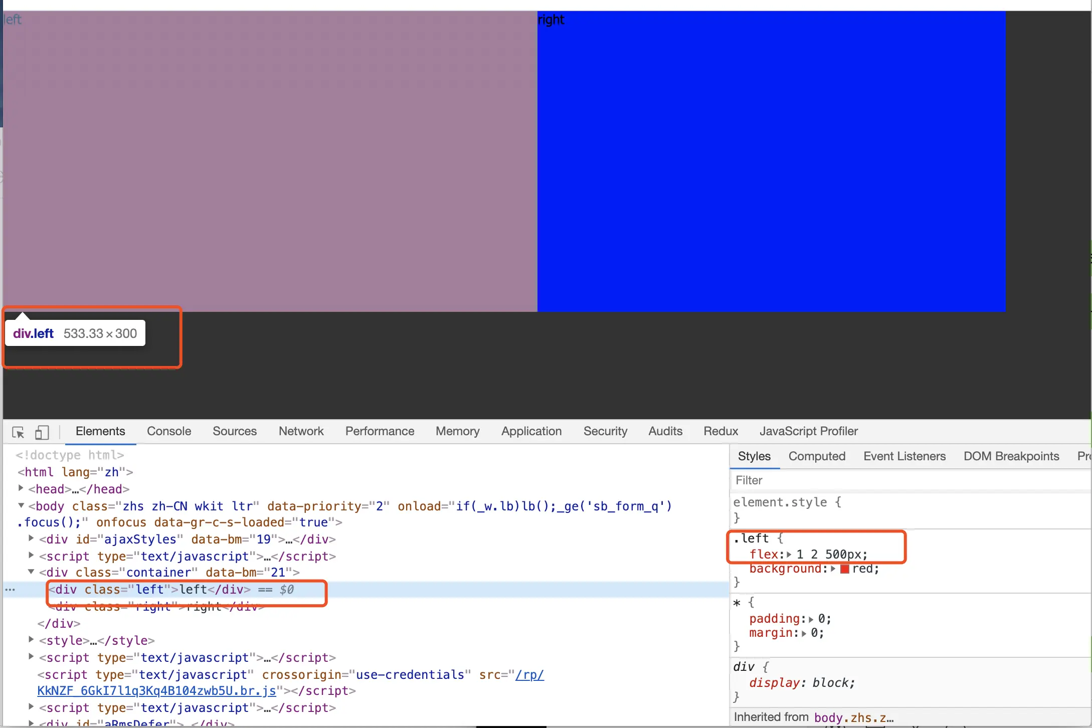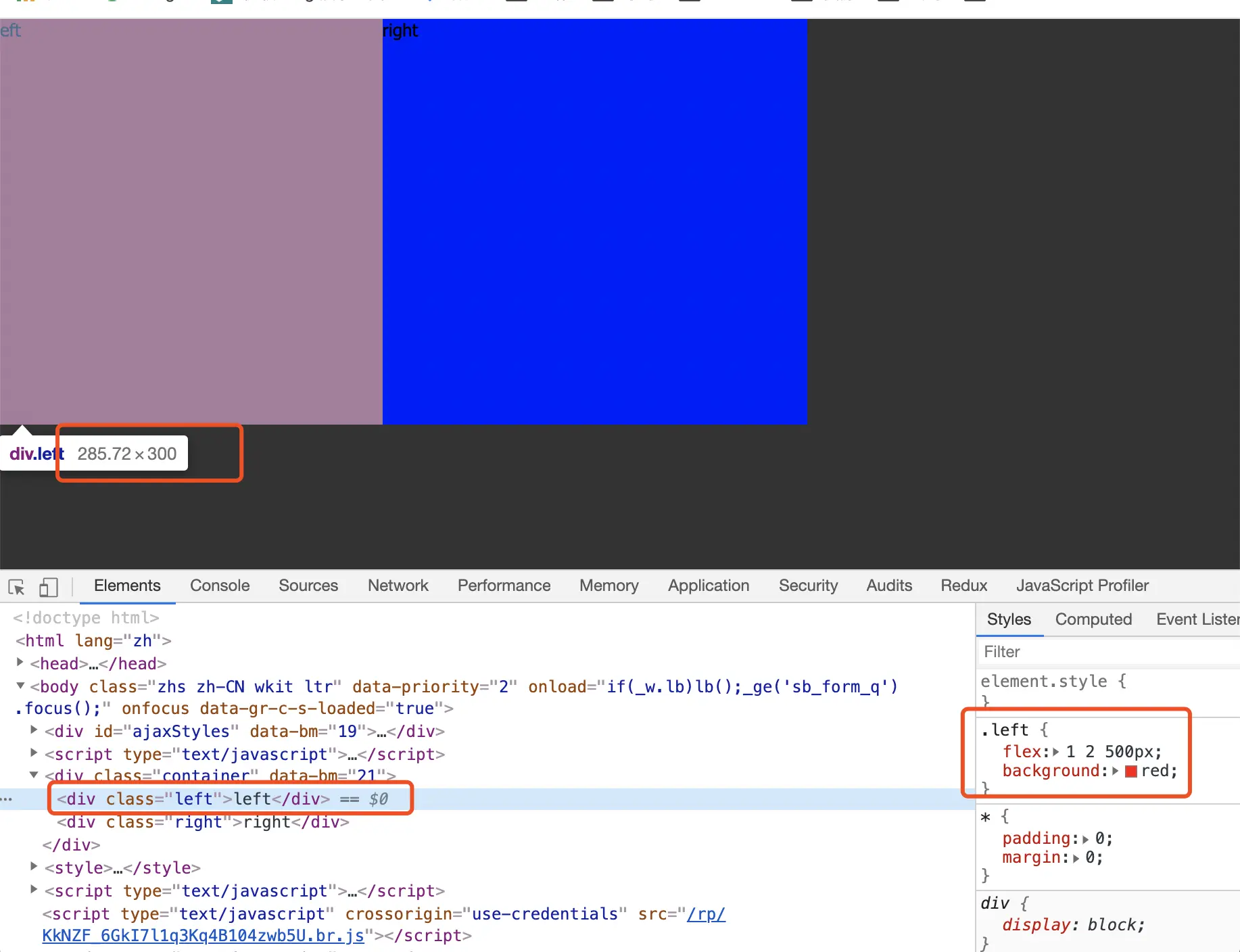 结果符合预期,当container 的 width = left 的 width + right 的 width,直接按各个 flex item 的 flow-basis 展示就好。