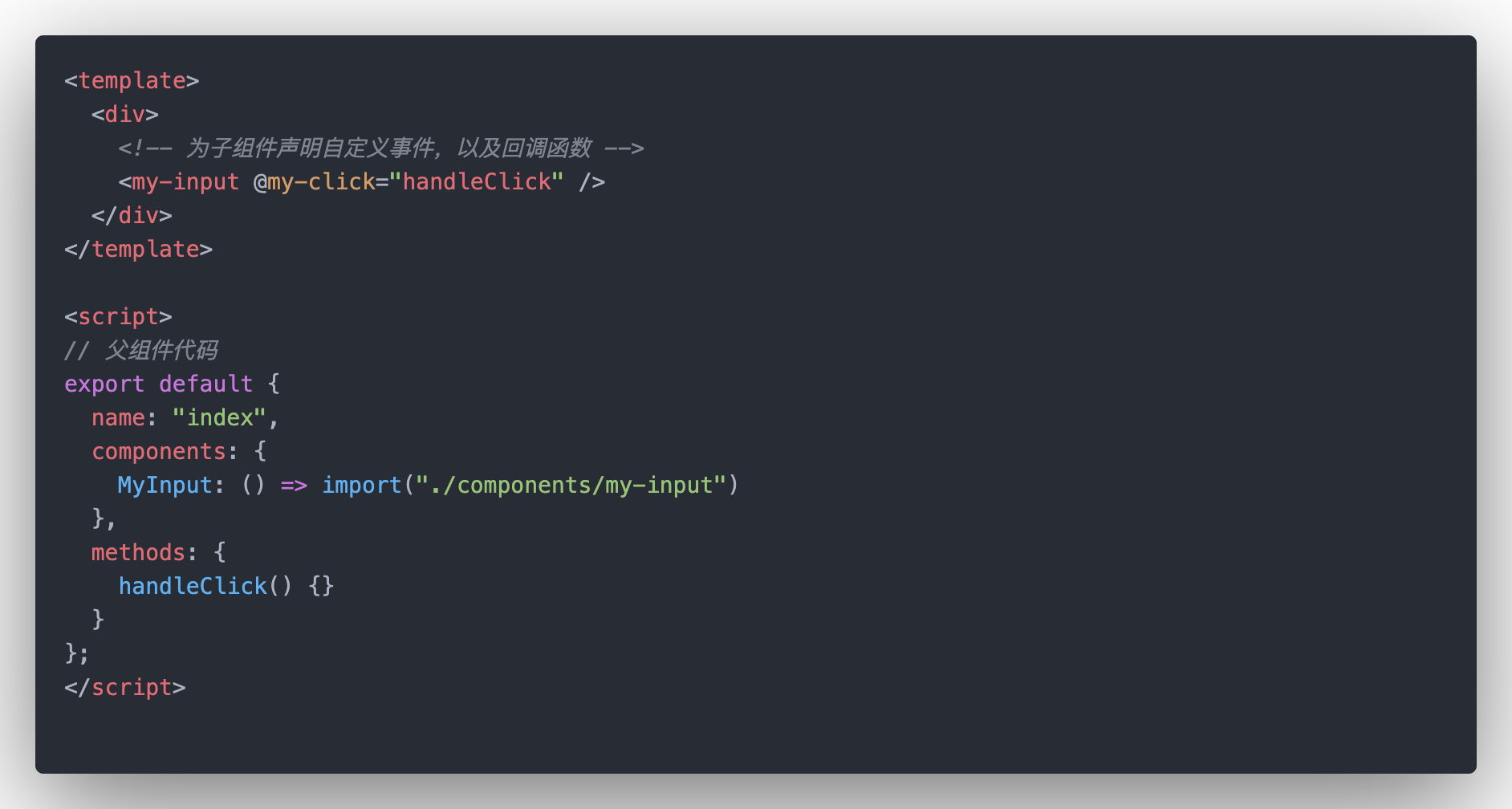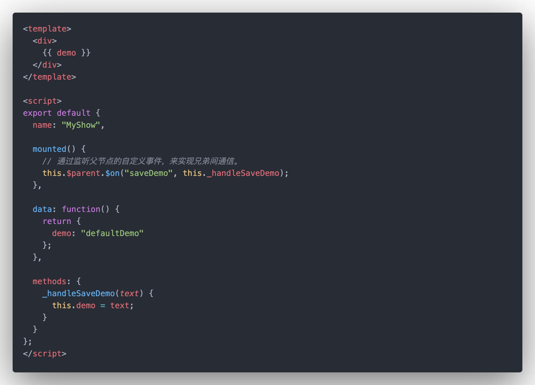 在兄弟节点中使用父组件声明监听一个自定义事件。