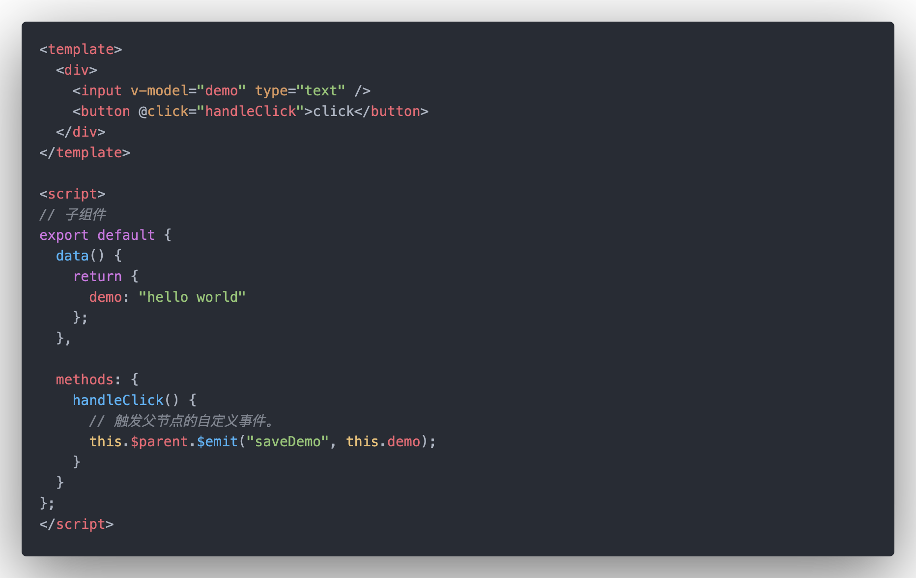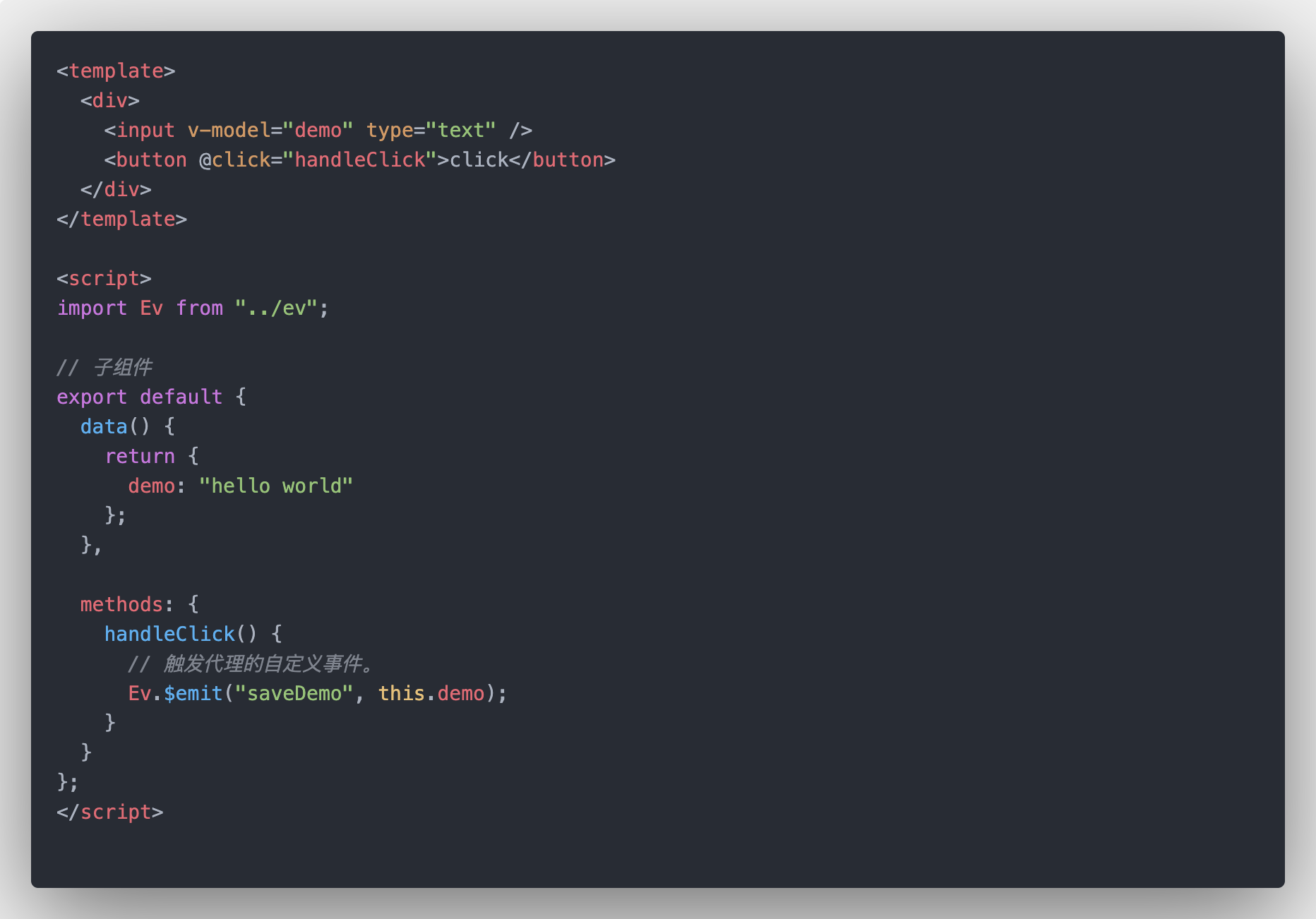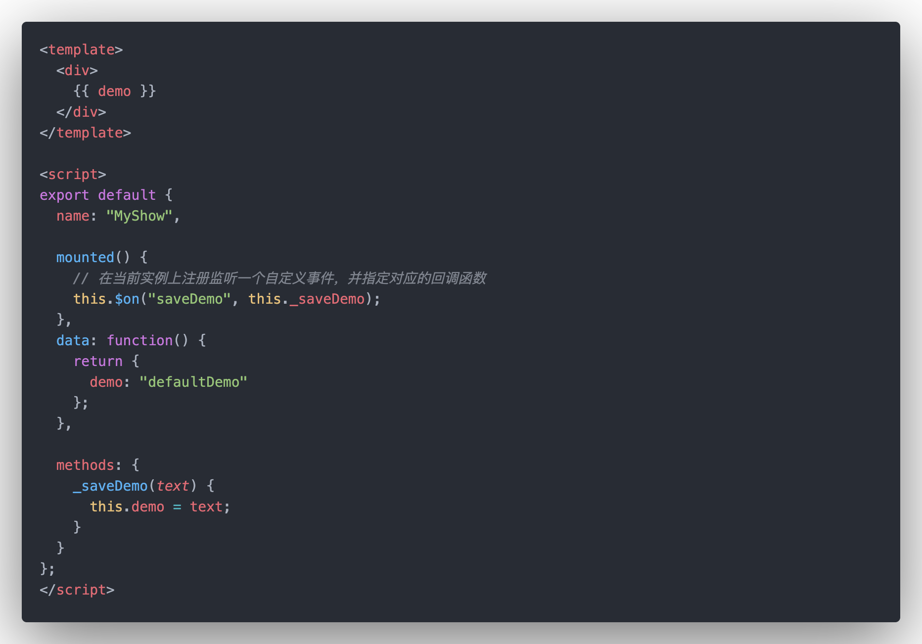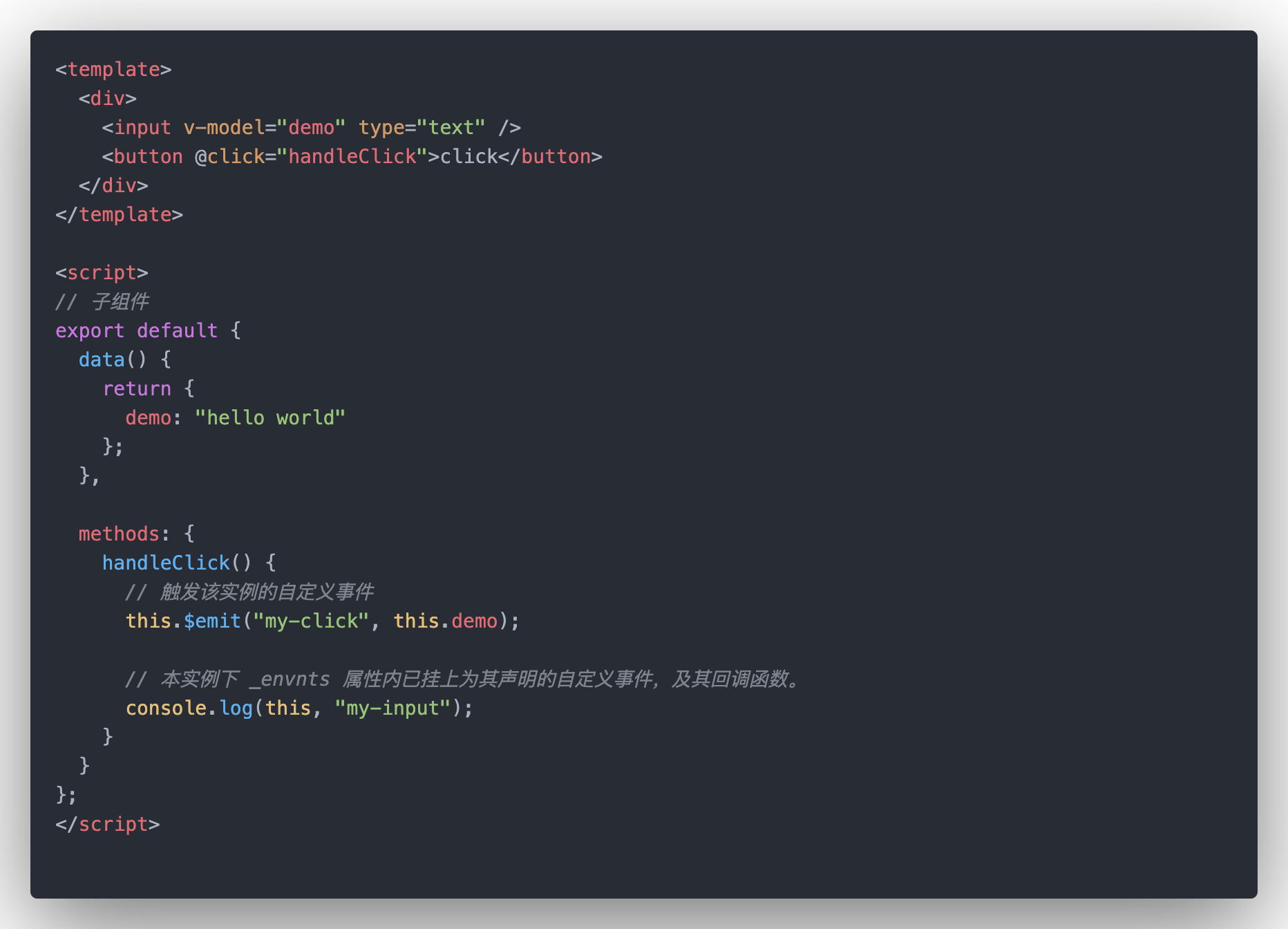 首先要明确的一个关键点是自定义事件本质是 在实例上挂一个“事件”,并为其绑定对应的回调。然后以编程式的方式在需要的时候去触发这个实例上的该“事件”。