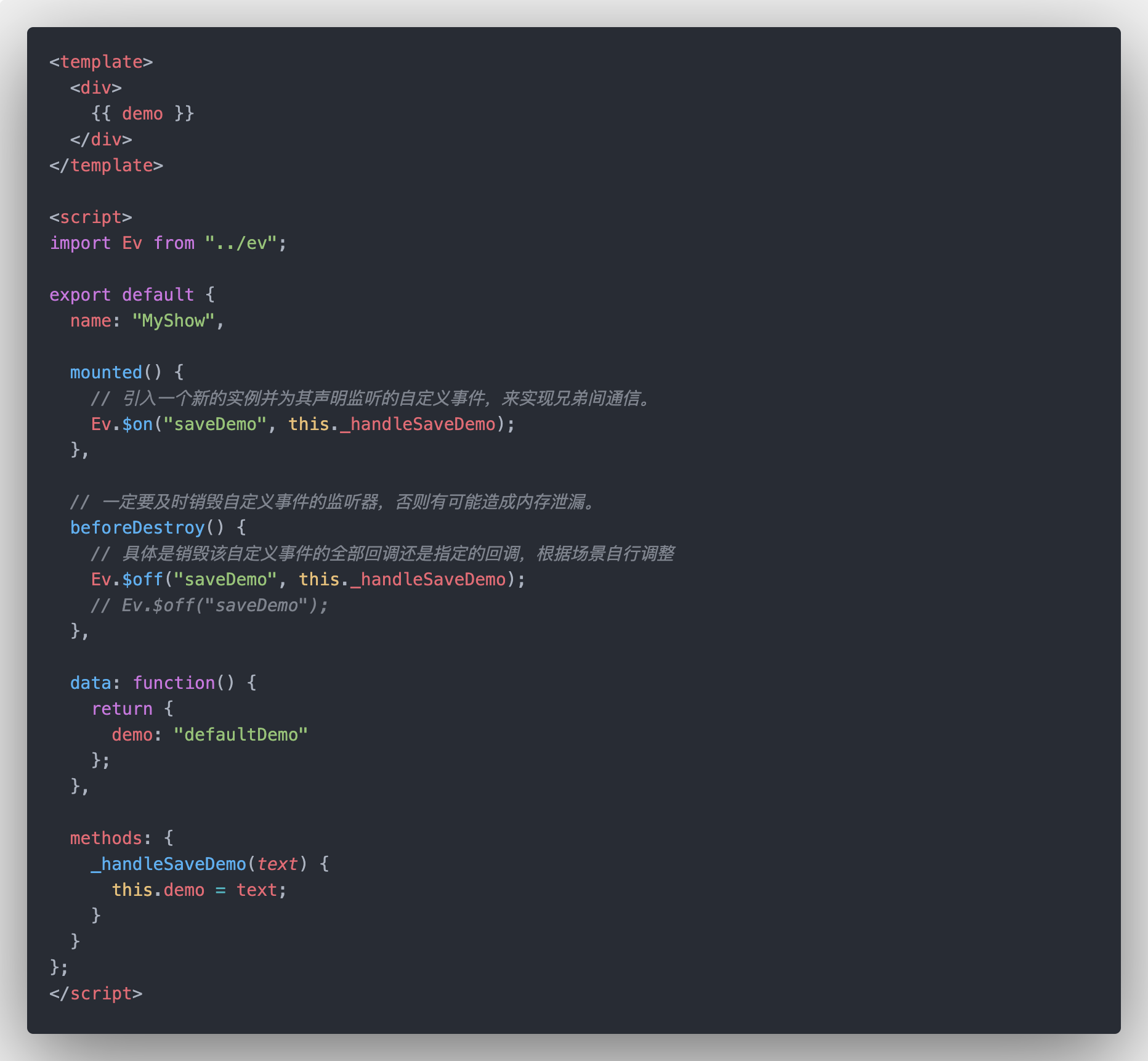 以代理的方式声明一个新的 Vue 实例,并为其声明要监听的自定义事件。务必需要注意的是,一定要及时的销毁自定义事件的监听器。