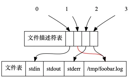 如果重定向操作是> /tmp/foobar.log 2>&1,则如下图所示