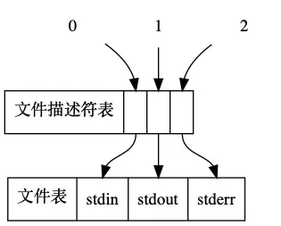 用图形可以更好地表达dup2的实现原理。下图是一个进程没有重定向时的状态,每个文件描述符都指向它们原本对应的文件