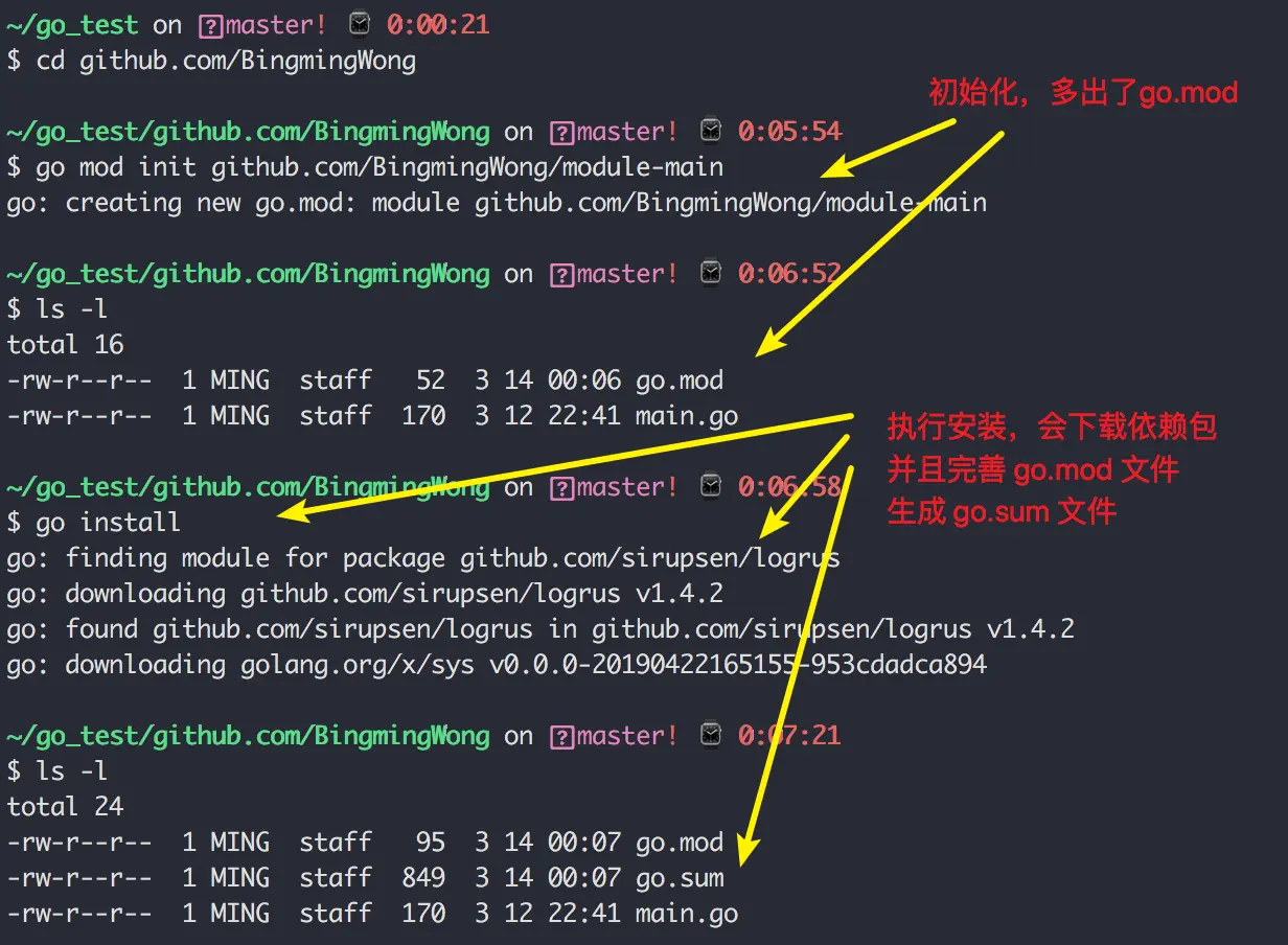 go mod init:初始化go mod, 生成go.mod文件,后可接参数指定 module 名,上面已经演示过。go mod download:手动触发下载依赖包到本地cache(默认为$GOPATH/pkg/mod目录)go mod graph: 打印项目的模块依赖结构