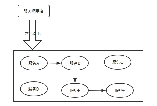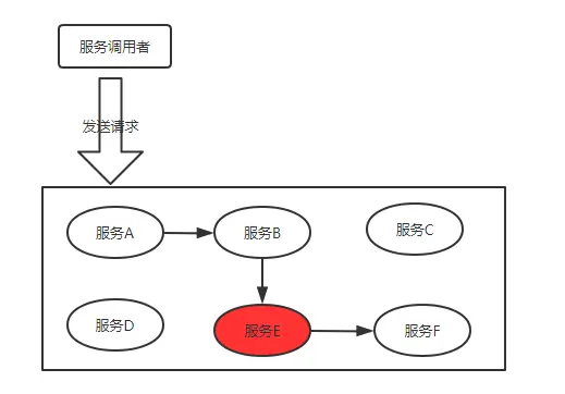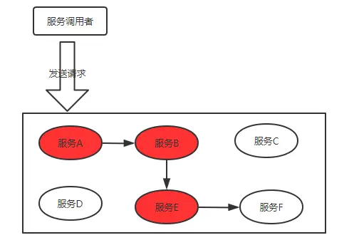 正常情况下,服务调用者发送请求,经过多个服务的传递到达服务F,服务F处理完毕后然后逐级返回,最终服务调用者拿到结果。