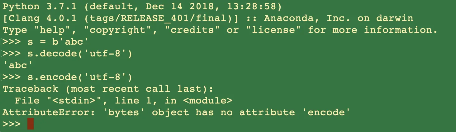 嗯,非常清楚,bytes类型和unicode 字符串的转换,当使用了不正确的编解码方式的时候会报错。然后我们再来看看python2的,上面说了,python2的str其实就是bytes,所以str只能解码不能编码。