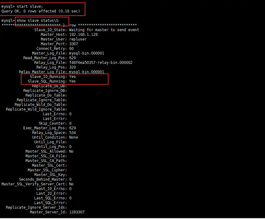change master to master_host='192.168.1.128',master_port=3307,master_user='repluser',master_password='123456',master_log_file='mysql-bin.000001',master_log_pos=629;
