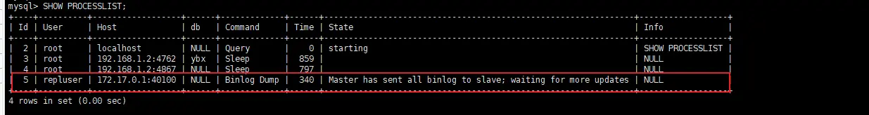 主机通过SHOW PROCESSLIST;查看进程信息,如下图可以明确看到主机已将binlog日志发送给从机,等待更多的更新操作