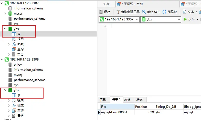 至此主从其实已经搭建完成,现在我们可以试试效果,现在我的主机和从机ybx数据库都没有表信息,我们现在创建一个user表