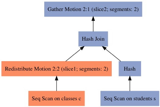 HashJoin需要相同关联键的所有数据都在⼀个 segment上,因⽽如果关联键不是分布键, 则需要数据移动。在这个例⼦中classes的分布键(id)和关联键(student_id) 不同,所以需要数据重分布。