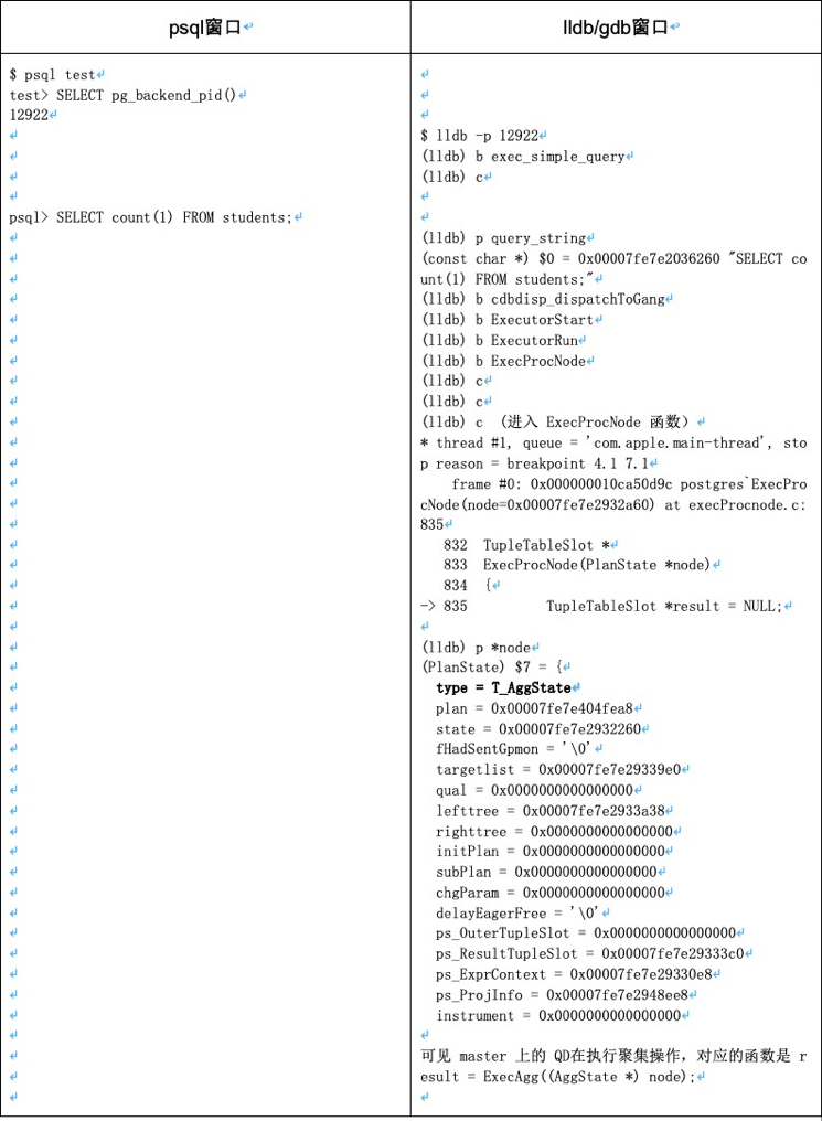下⾯以⼀个例⼦介绍如何调试 GreenplumQD进程。启动两个窗⼝,⼀个运⾏psql,⼀个运⾏ lldb