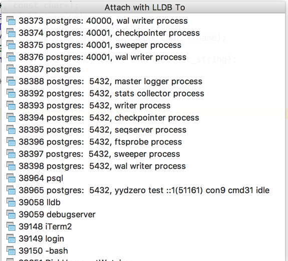 然后选择 Run → Attach to Local Process… 出现下面 “Attach with LLDB to” 窗口。选择需要调试的进程id即可。(如果确定进程id请见前面小节)