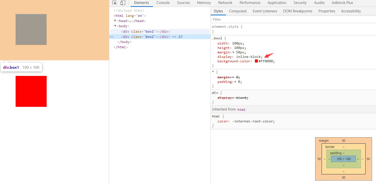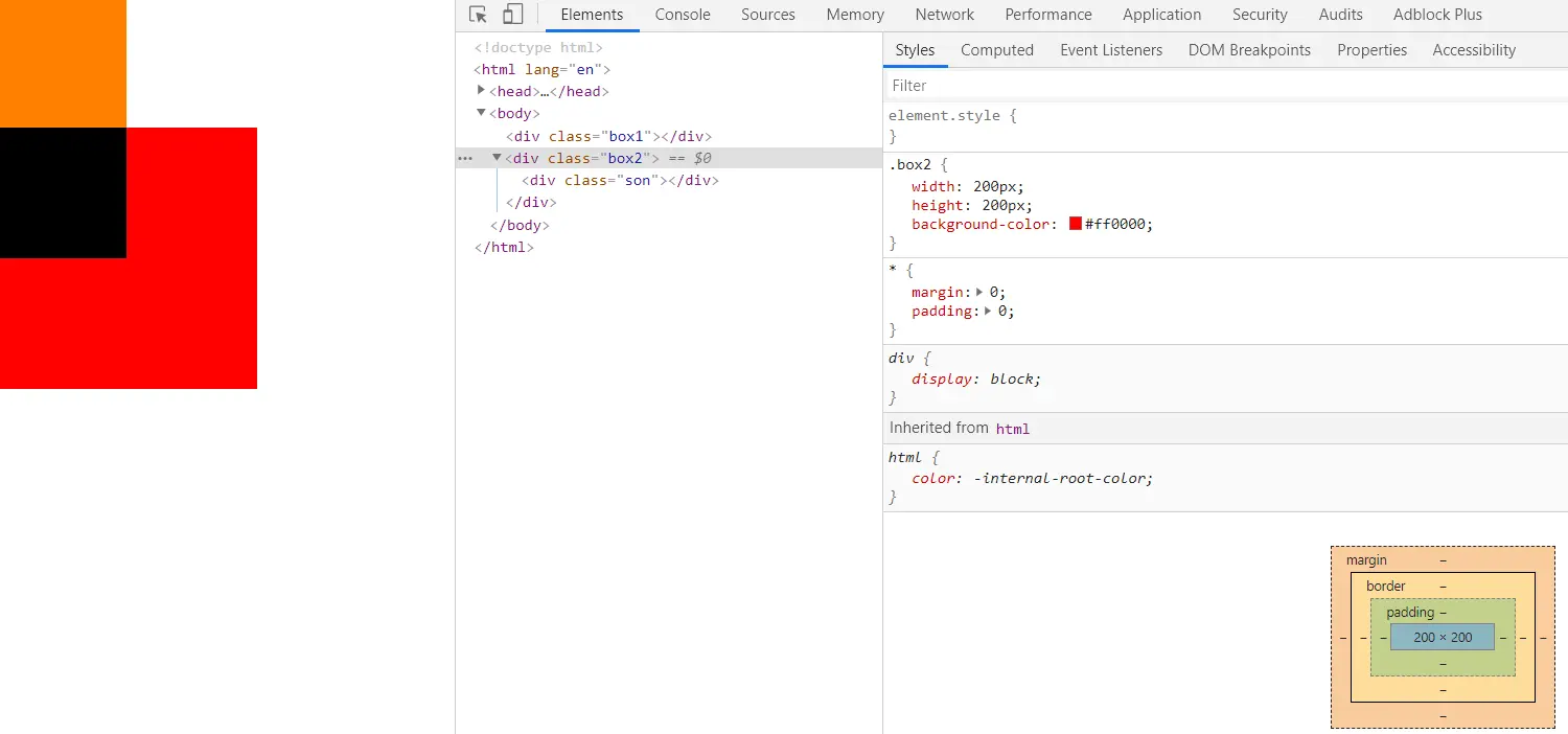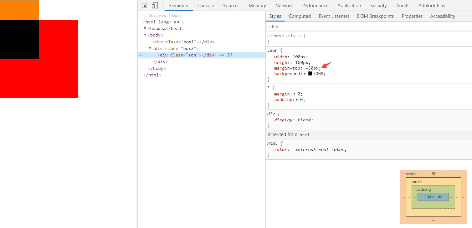 margin-top:-50px属性就会发现,红色盒子(box2)和橙色盒子(box)在页面的布局改变了,红色盒子(box2)覆盖了橙色盒子(box1);但是我们想让黑色盒子盒子添加margin-top:-50px属性,页面布局不发生改变,怎么做呢?