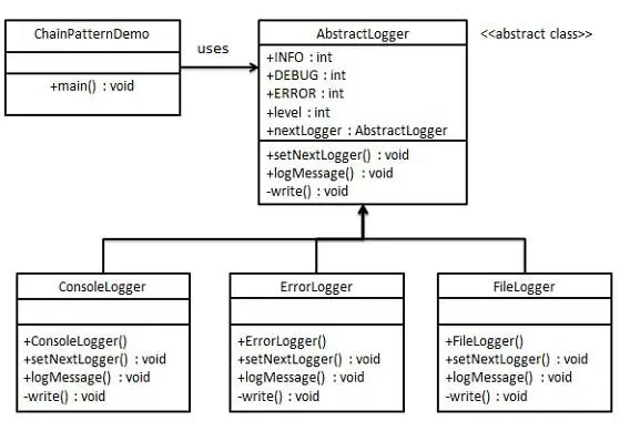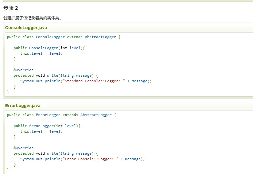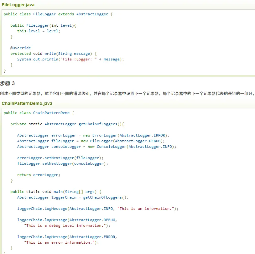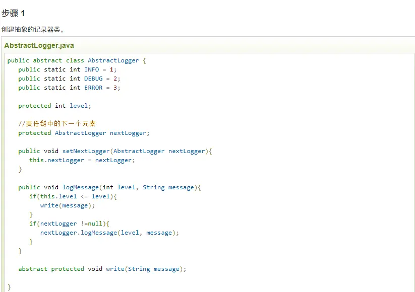 实现 我们创建抽象类 AbstractLogger,带有详细的日志记录级别。然后我们创建三种类型的记录器,都扩展了 AbstractLogger。每个记录器消息的级别是否属于自己的级别,如果是则相应地打印出来,否则将不打印并把消息传给下一个记录器
