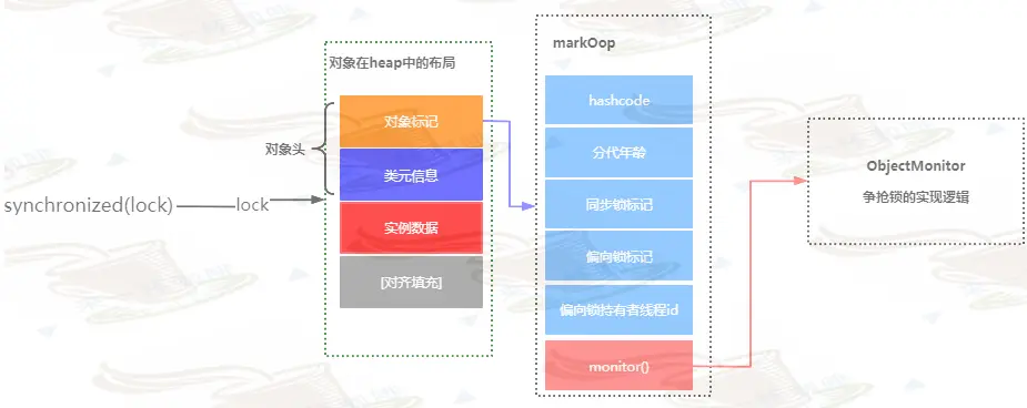 每一个Java对象都会与一个监视器monitor关联,可以把它理解成一把锁,当一个线程要执行用Synchronized修改的代码块或者对象时,该线程最先获取到的是Synchronized修饰对象的monitor。 重量级加锁的基本流程:
