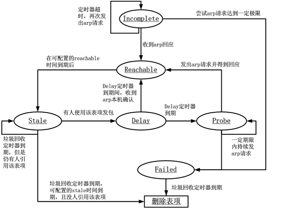 之所以使用stale状态,是因为要减少网络中arp交互的开销,也就是尽量减少arp交互,但当条目变为stale之后,就说明,使用这个条目是不安全的不确定的。但是如果有应用用到这个条目发包,linux内核仍不进行arp交互,而是设立了一个delay的状态,在这个状态的持续过程中,收到了来自邻居的包,那么说明,此条目可用,则转为reachable的状态,如果没有,那么则会真正的进行arp交互,如果还没有,那么说明在这个网络中,此ip已经不对应任何一个mac地址,也没有必要存在了,置为failed。