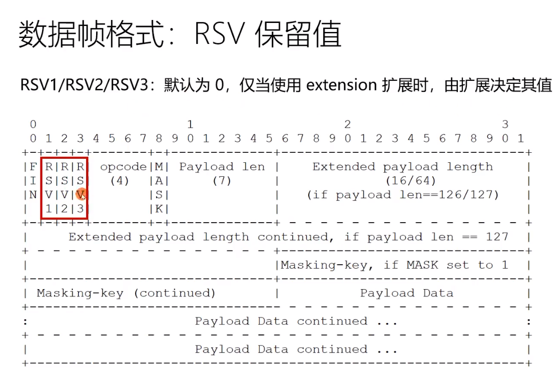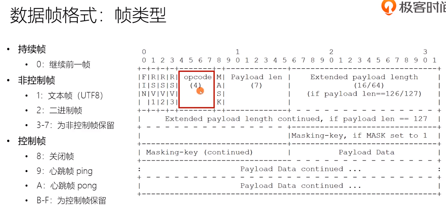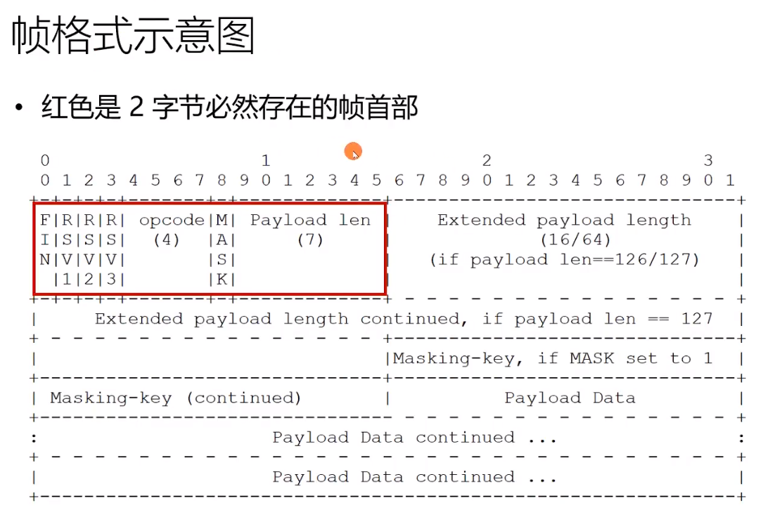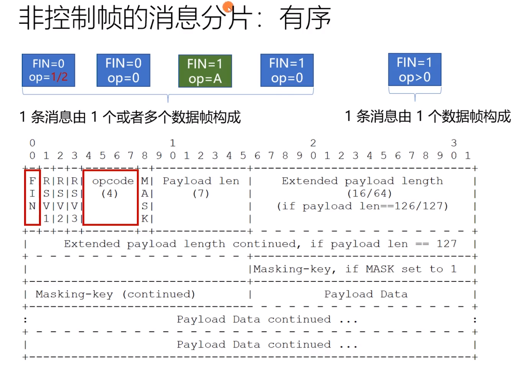 下方绿色为中途插入的控制帧, 左边三个蓝色的为消息帧,FIN = 0说明消息没有结束 op=1/2为文本帧/二进制帧,三个蓝色的帧拼接为一个消息