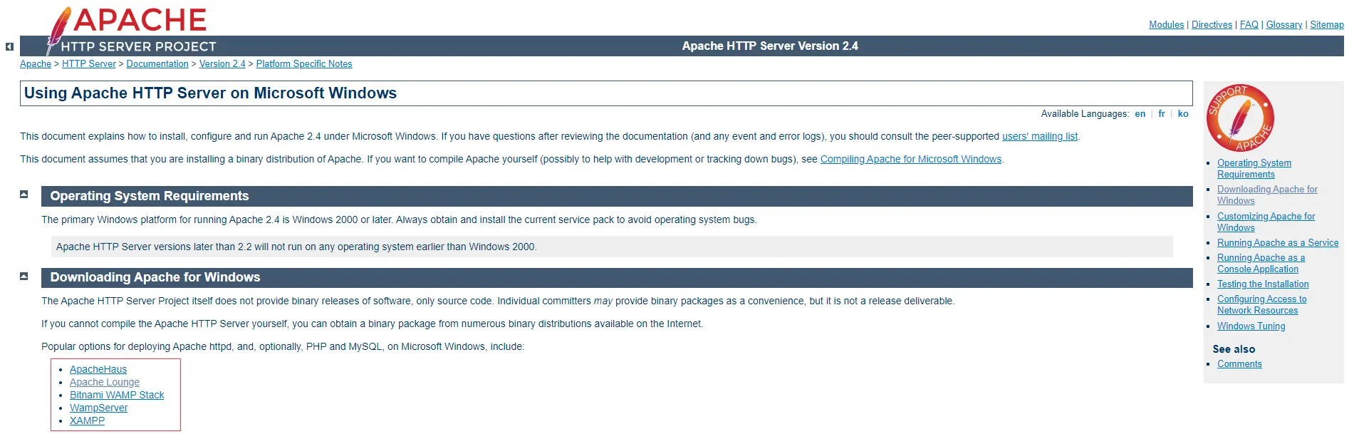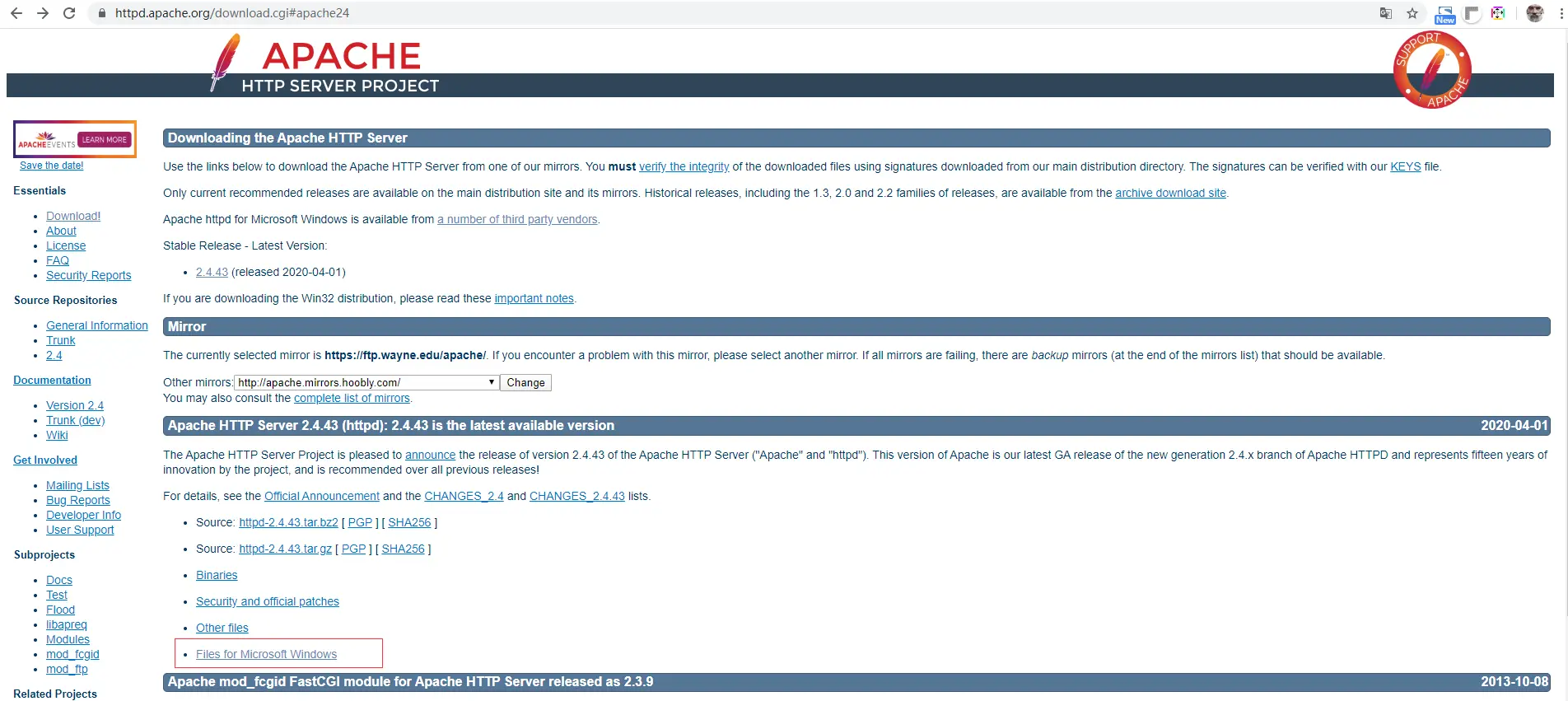 首先,访问Apache Http Server官网:httpd.apache.org/ ,进入页面后点击左侧的"Download!"链接,在新页面中找到"Files for Mincrosoft Windows"链接并点击进入,如下图: