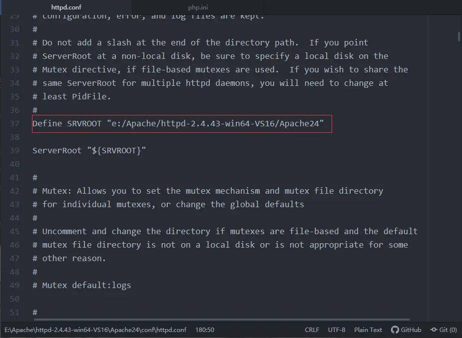 然后,将下载到本地的压缩包解压到合适的目录中,例如:"E:/Apache/"目录中。解压完成后,进入"E:/Apache/http-2.4.43-win64-VS16/Apache24/conf"目录(具体路径根据你解压的目录为准),找到httpd.conf文件并打开,改文件是Apache Http Server的配置文件。打开文件后,找到Define SRVROOT配置项,配置Server的根目录如下: