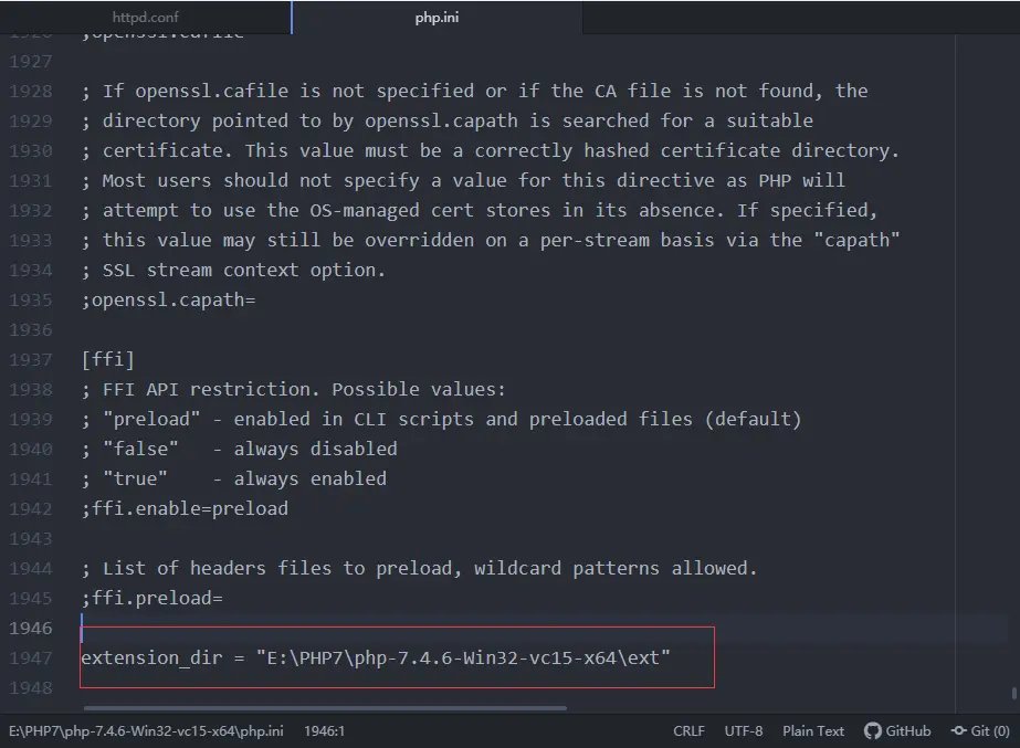 extension_dir = "E:\PHP7\php-7.4.6-win32-vc15-x64\ext"