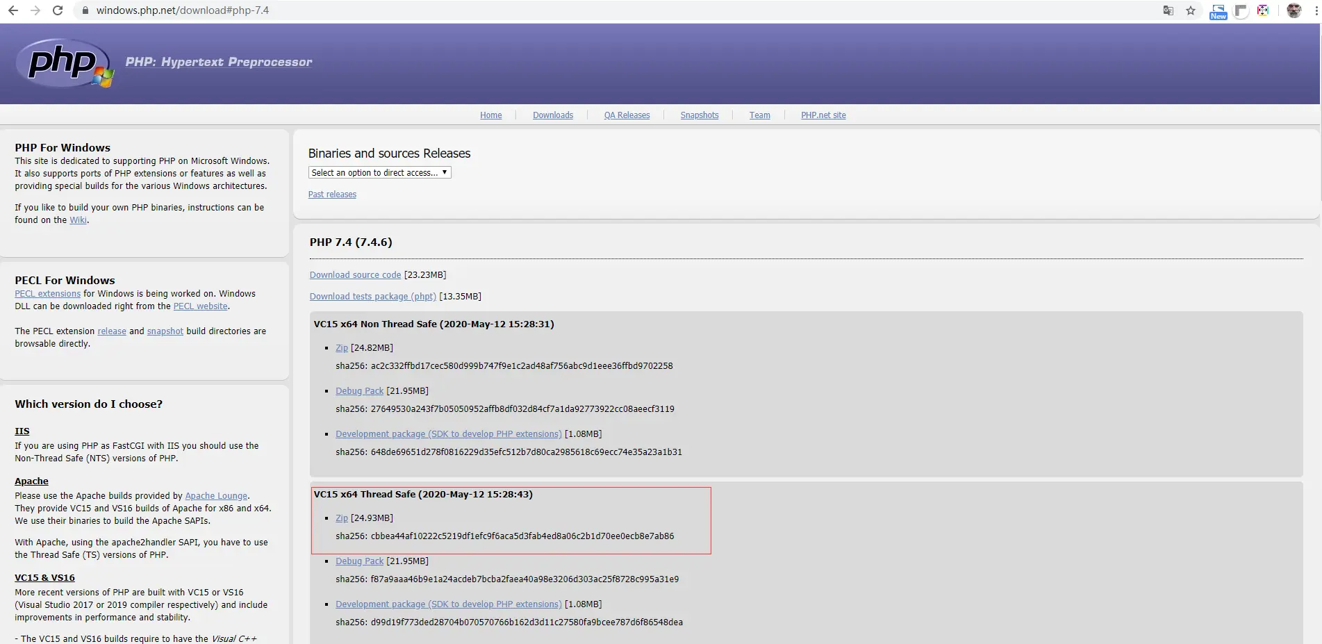 首先,访问PHP官网:www.php.net/,点击顶部"Donlo…"Thread Safe"版本并下载,如下图: