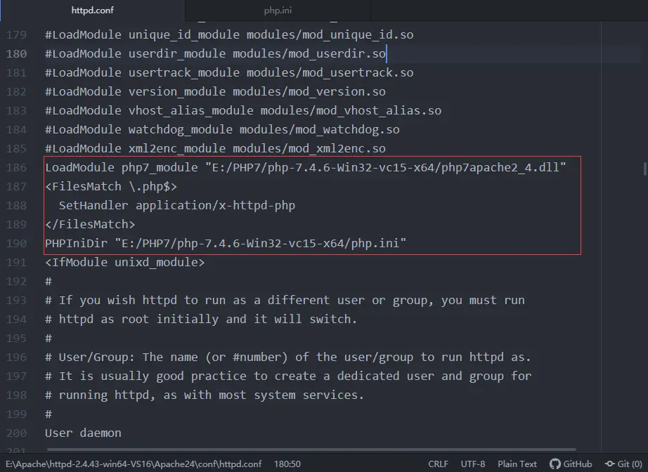 PHPIniDir "E:/PHP7/php-7.4.6-win32-vc15-x64/php.ini" #设置PHP配置文件路径