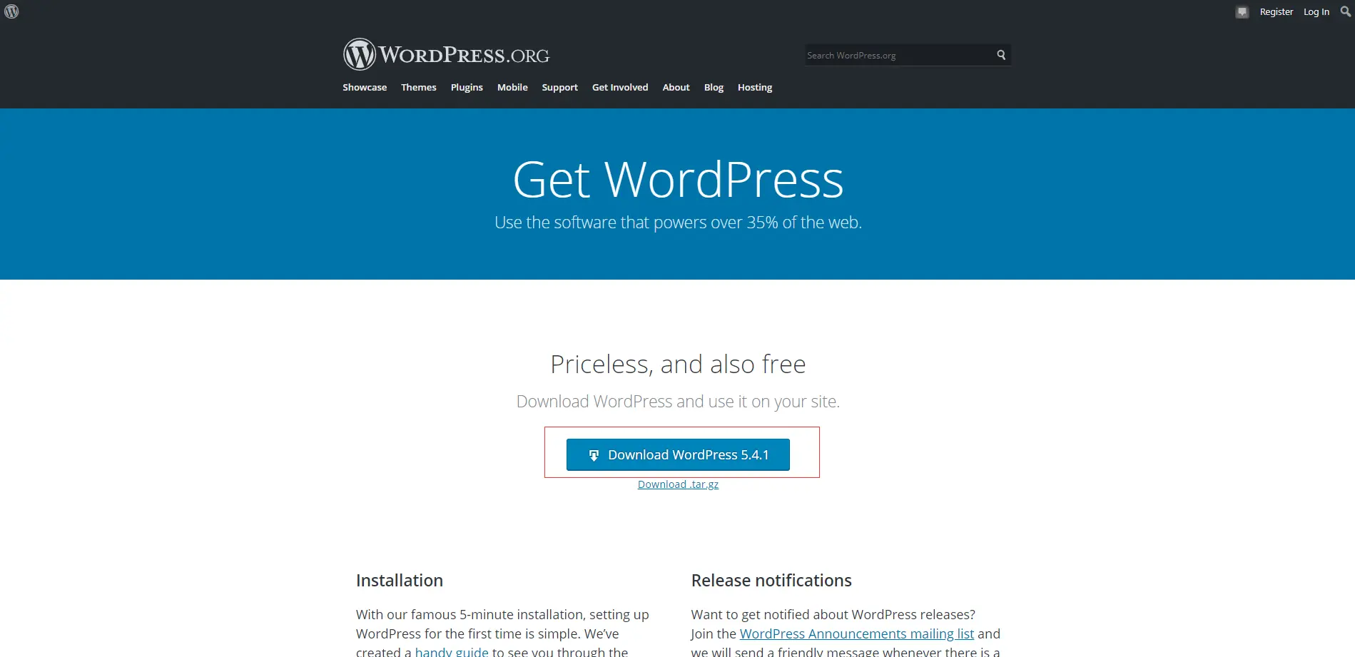 由于MySQL数据库的安装配置比较简单,在此不再赘述。访问Wordpress官网并下载最新版本的软件包到本地:wordpress.org/download/。