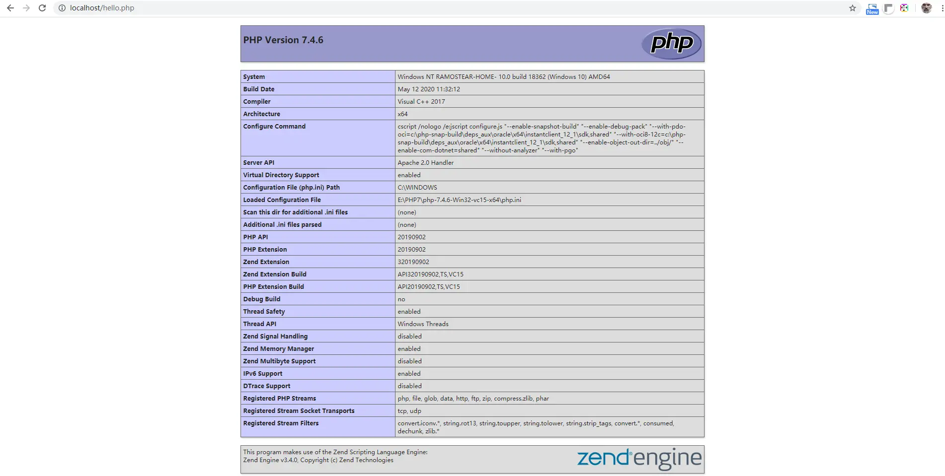 重启服务后,打开浏览器并访问:http://localhost/index.php,如果正常显示PHP配置信息,则表明Apache Http Server与PHP整合成功,如下图: