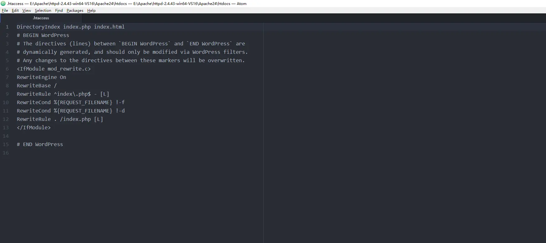 在Apache Http Server的htdocs目录中创建名为**.htaccess**的文件,然后编辑内容如下:
