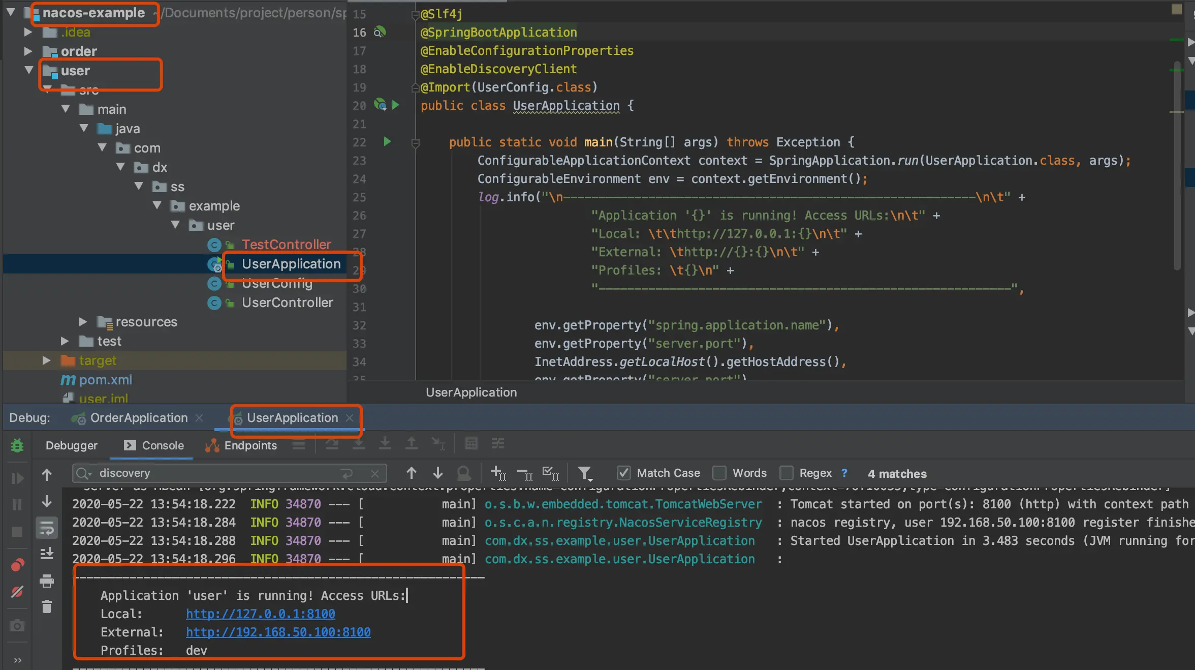 至此 user 和 server 2个springboot项目 以pod的方式跑起来了 也注册到了 宿主机上的nacos服务上