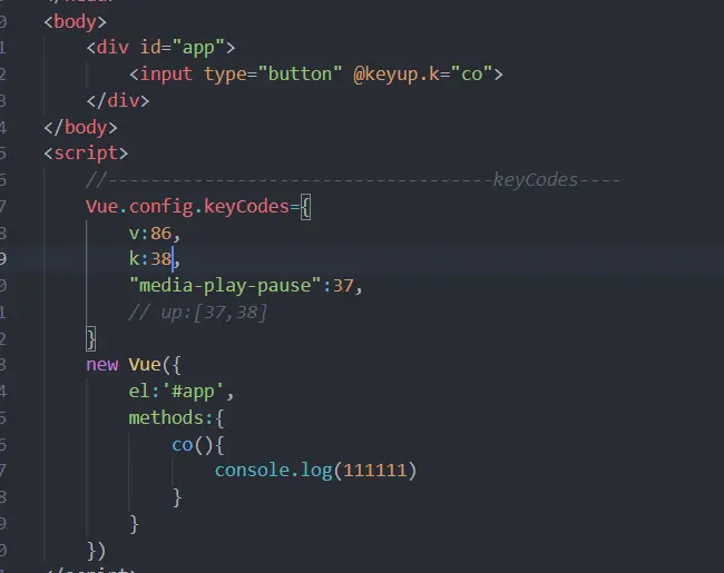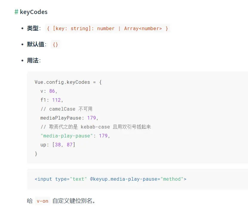 关于keyCodes(作者私人仓库) MrLiAng105105 2020-05-23 189 阅读1分钟 www.jianshu.com/p/99dd28ce9… 左边的v.k、up啥的,就是keyup后面跟的名字。 然后一个名字可以对应一个键码,也可以对应一个键码数组。