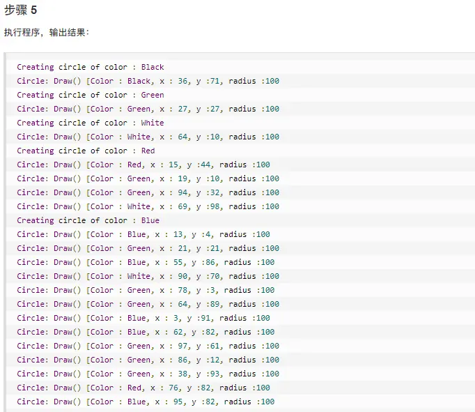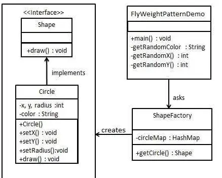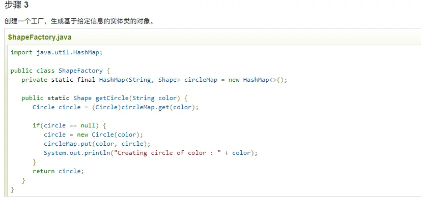 ShapeFactory 有一个 Circle 的 HashMap,其中键名为 Circle 对象的颜色。无论何时接收到请求,都会创建一个特定颜色的圆。ShapeFactory 检查它的 HashMap 中的 circle 对象,如果找到 Circle 对象,则返回该对象,否则将创建一个存储在 hashmap 中以备后续使用的新对象,并把该对象返回到客户端。
