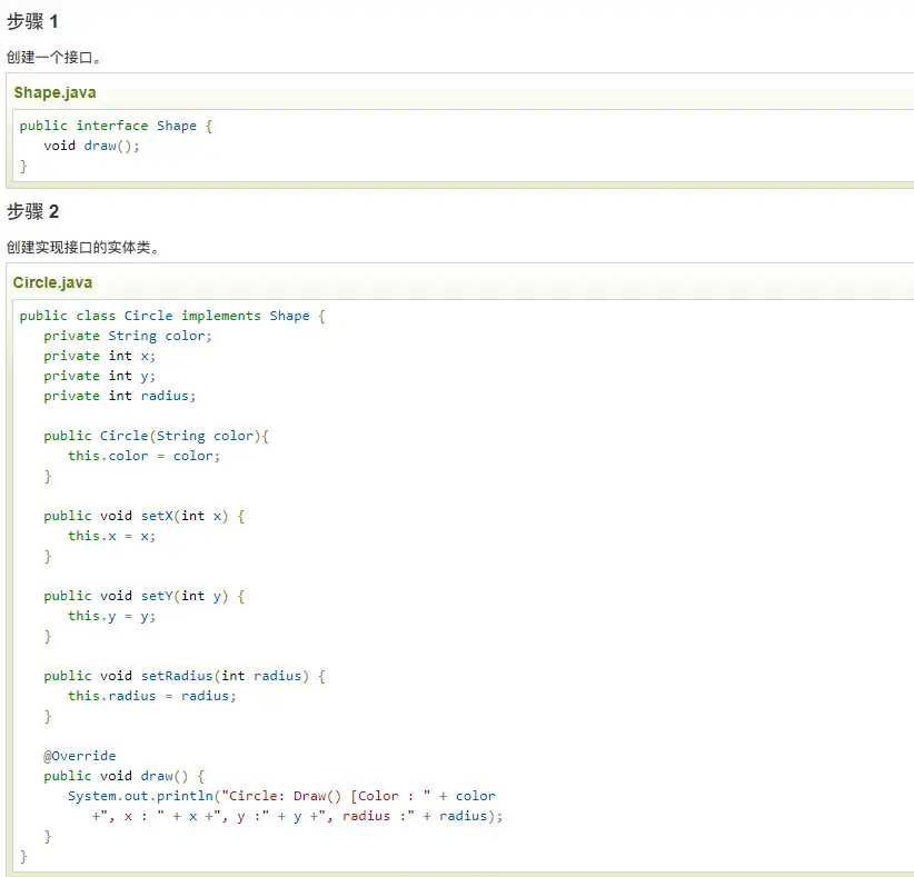 我们将创建一个 Shape 接口和实现了 Shape 接口的实体类 Circle。下一步是定义工厂类 ShapeFactory。