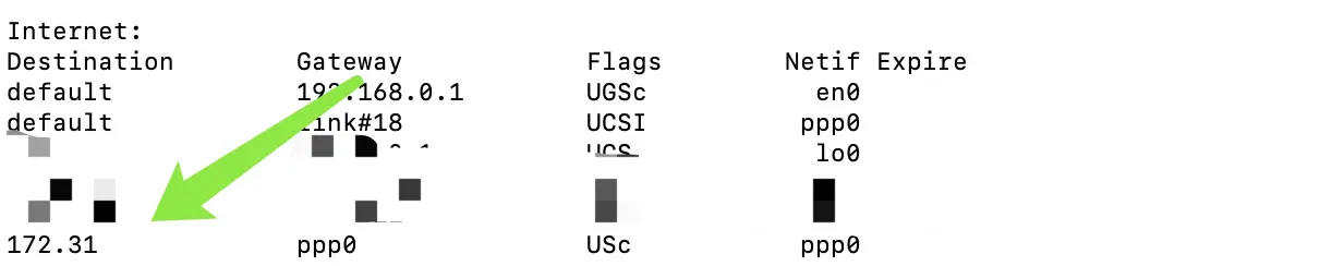 其中ppp0是经以太网接口PPP拨号时创建的链路接口,通常vpn就是使用这个接口. 如果不确定可以查看一下,比如我们连的vpn是172.31.xxx.xxx