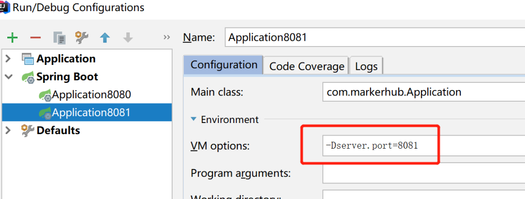 有些同学不知道怎么用idea同一个项目分别启动两个端口,其实很简单,只需要在 Run/DebugConfigurations的 VM options上,指定启动端口 -Dserver.port=8081即可!