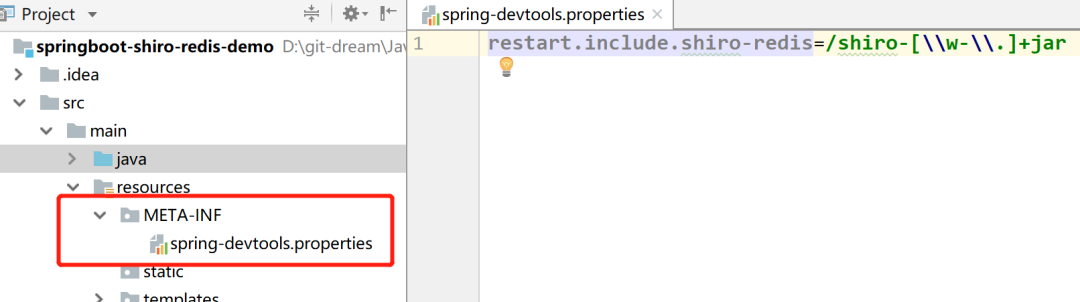 所以,第四步:只需要在resources新建一个文件夹META-INF,然后新建文件spring-devtools.properties,内容为: