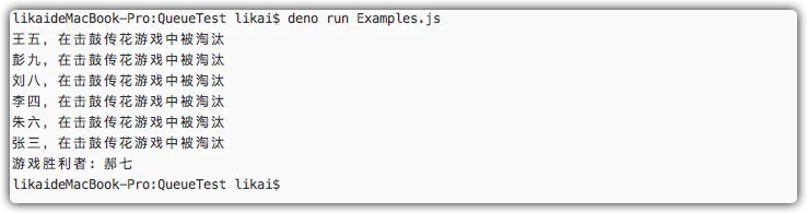 - 传进来的次数遍历完成(鼓声停止),队首元素出栈,将队首元素追加至淘汰人员列表中。