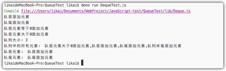 双端队列相比队列多了两端都可以出入元素,因此普通队列中的获取队列大小、清空队列、队列判空、获取队列中的所有元素这些方法同样存在于双端队列中且实现代码与之相同。