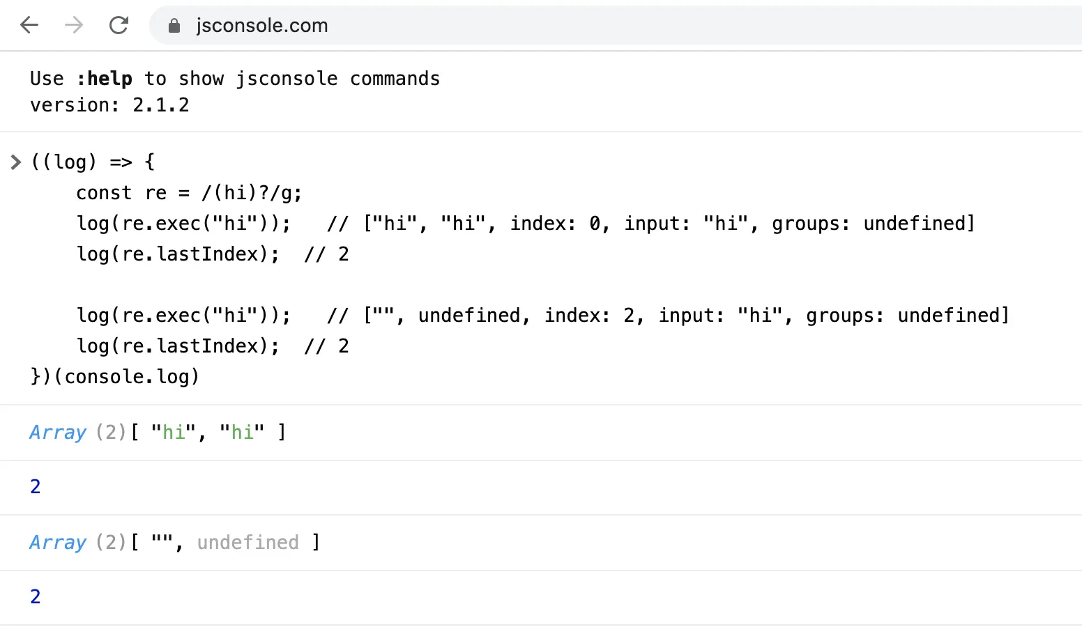 log(re.exec("hi")); // ["hi", "hi", index: 0, input: "hi", groups: undefined]