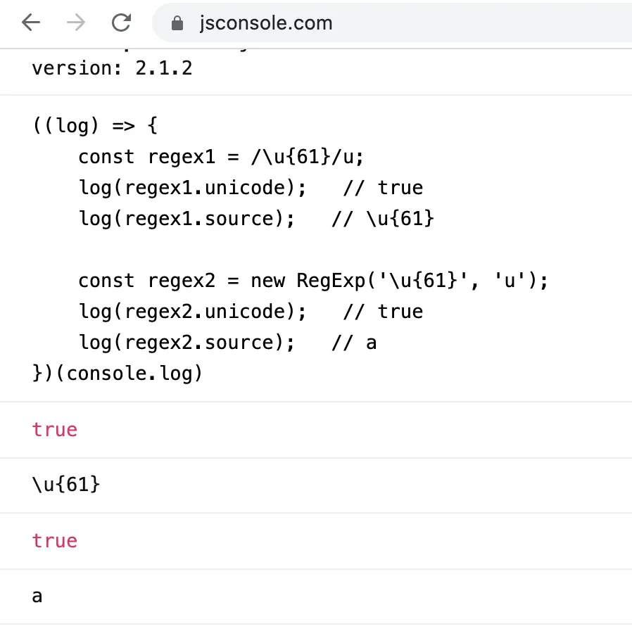 const regex2 = new RegExp('\u{61}', 'u');