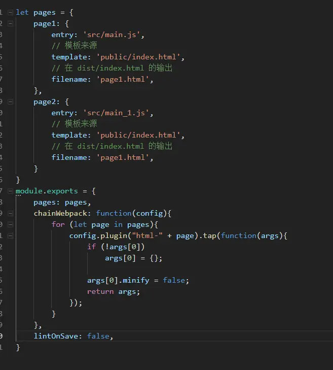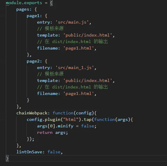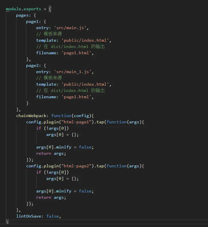 然后发现了宝贝,可以看到上图中,包含html这插件,但同时也包含html-page1和html-page2这两个插件,于是修改vue.config.js