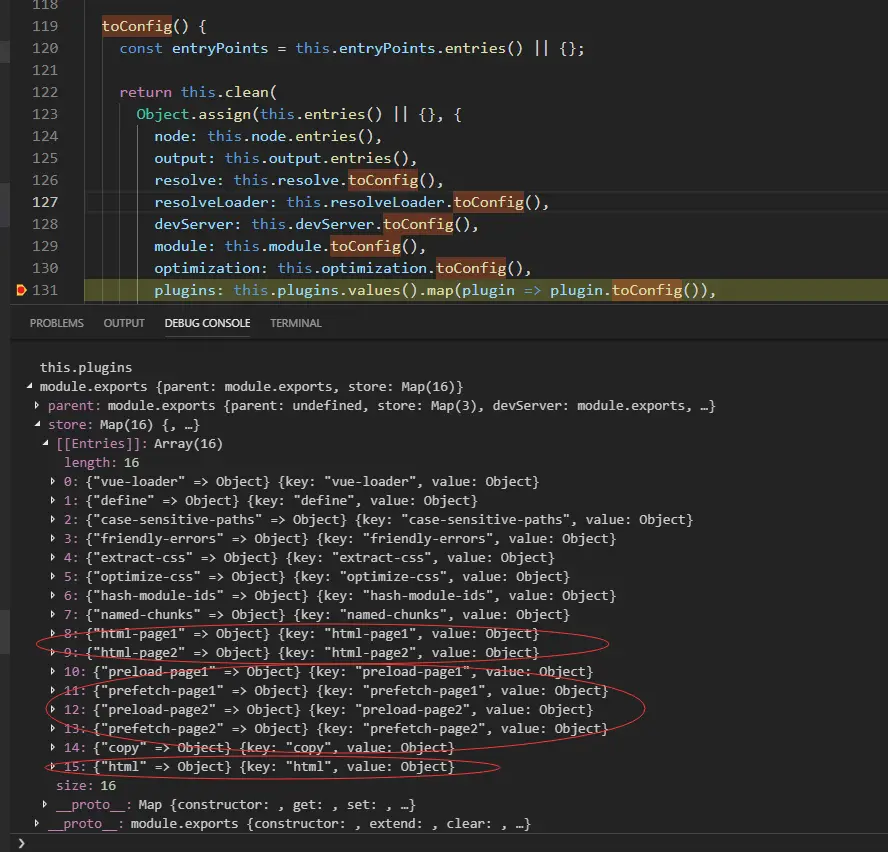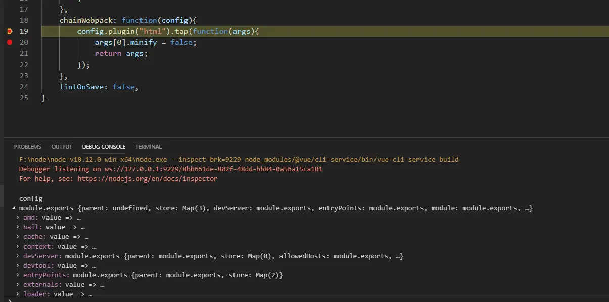 在chainWebpack函数中触发了断点,查看config对象(在DEBUG CONSOLE里面输入命令可以对对象进行一些操作的)