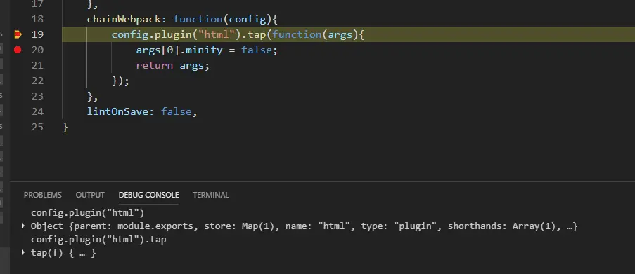 因为知道vue其实在打包的过程中使用了很多plugin默默地为我们解决了很多事情,所以其实加载的时候会有很多plugin,于是我默默的等待,等到了一个为undifine的plugin,get了一下args发现里面只有一个minify:false这么一对值,确认是我要设置的plugin,但为什么会是undefine呢,于是我给这地方设置了条件断点,当!plugin的时候就停下来,当断点再次停下来之后,我查看了堆栈