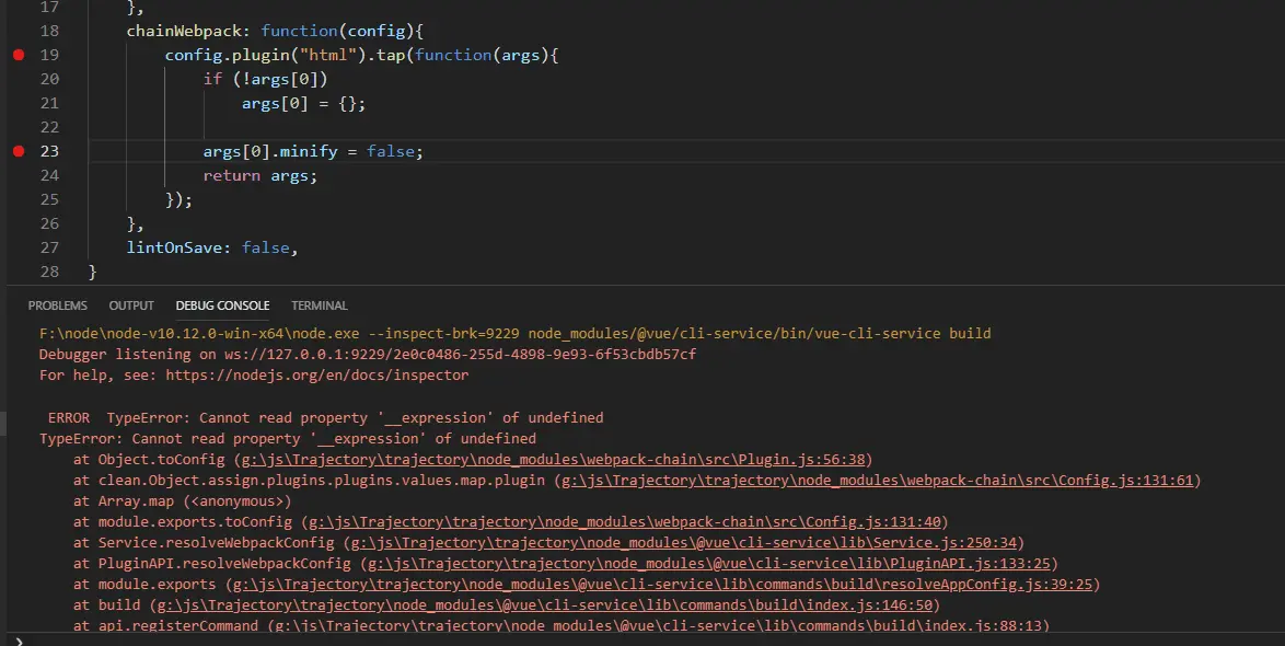 - Building for production... ERROR TypeError: Cannot read property '__expression' of undefined TypeError: Cannot read property '__expression' of undefined at Object.toConfig (G:\js\Trajectory\trajectory\node_modules\webpack-chain\src\Plugin.js:56:38)