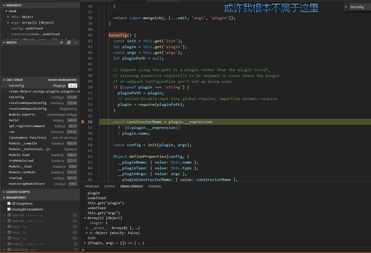 看来要掏真家伙了,找到报错栈顶的这一行,是Plugin.js这文件的问题。在vscode里面,按住ctrl并且单击报错栈最上层的node_modules\webpack-chain\src\Plugin.js文件,找到报错的地方,同样上断点。我来康康到底是怎么肥事!