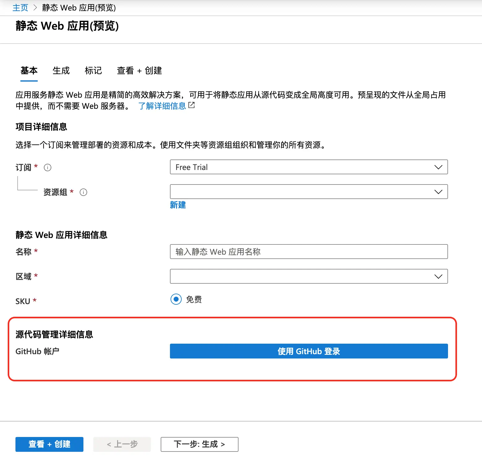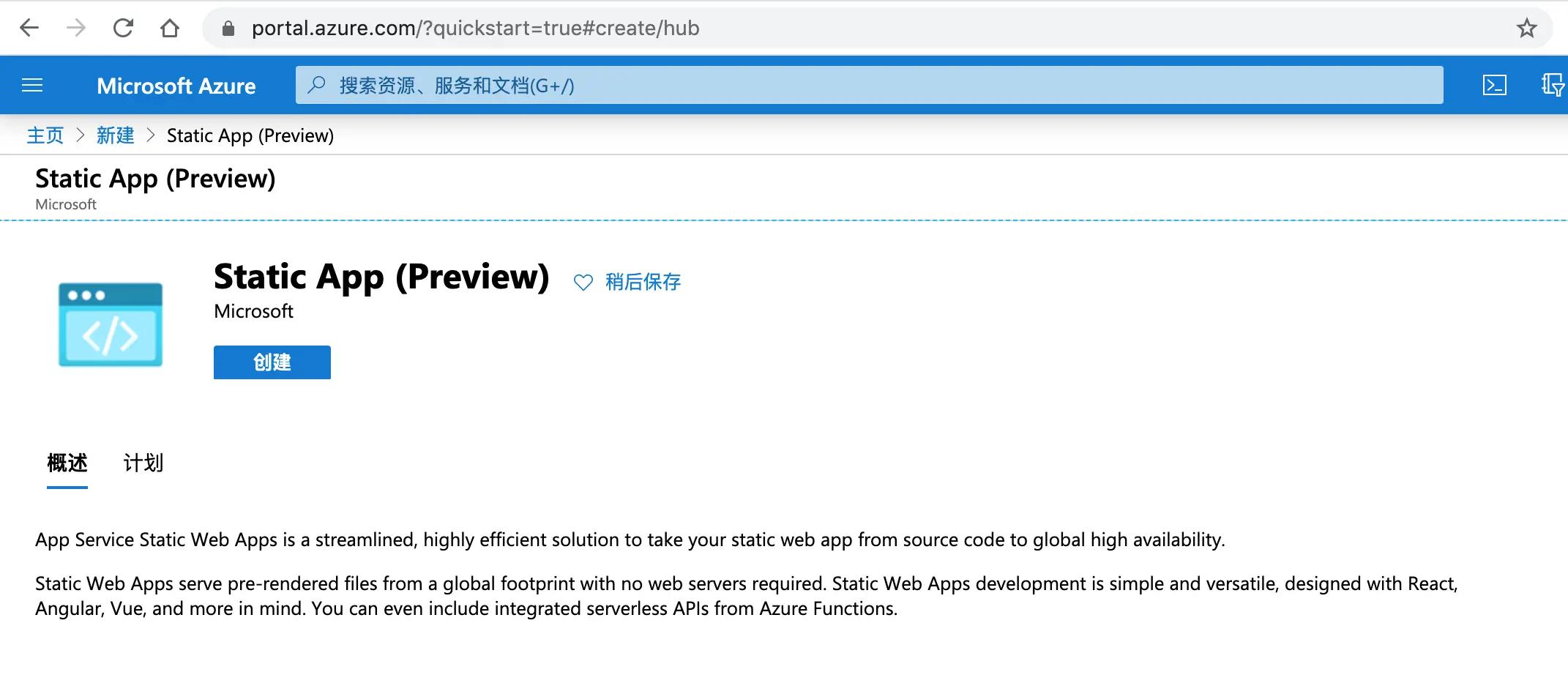 注册登录后,在 Azure Portal 页面(https://portal.azure.com/)点击创建资源,搜索 Static Web App 进入以下页面,点击创建按钮即可进行创建: