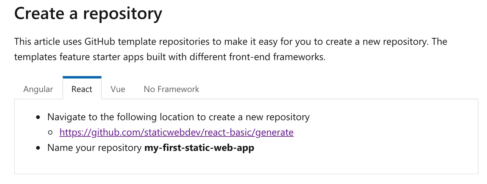 在使用 Github 登录之前,需要先在 Github 那边准备好一个项目,而 Azure 提供了主流框架的创建模板,从模板能够非常快速的创建一个自己的项目,我选择的是 React: