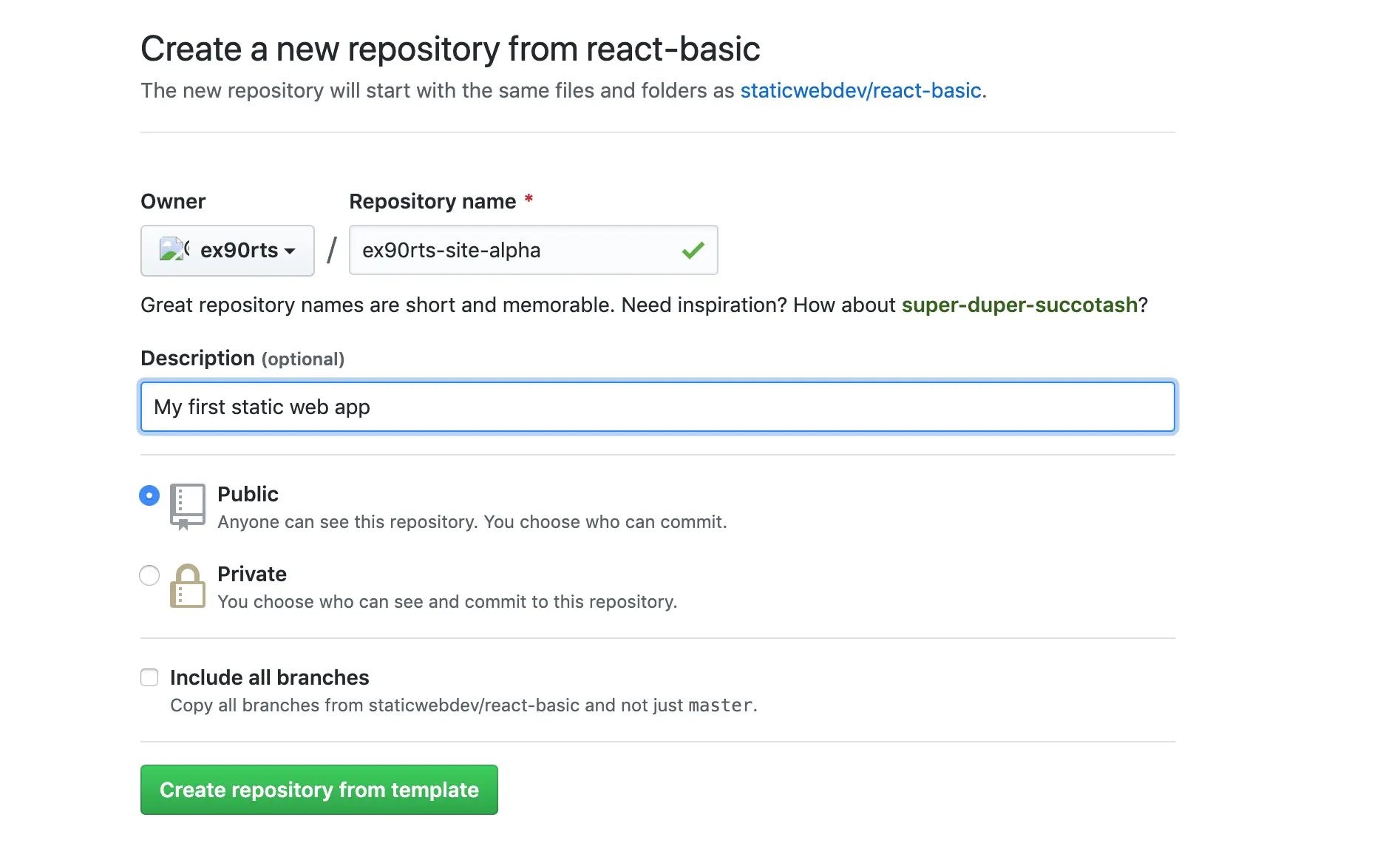 点击官方文档中的模板创建连接,即会进入 Github 创建页面,给项目命名后点击“从模板创建仓库”按钮即可: